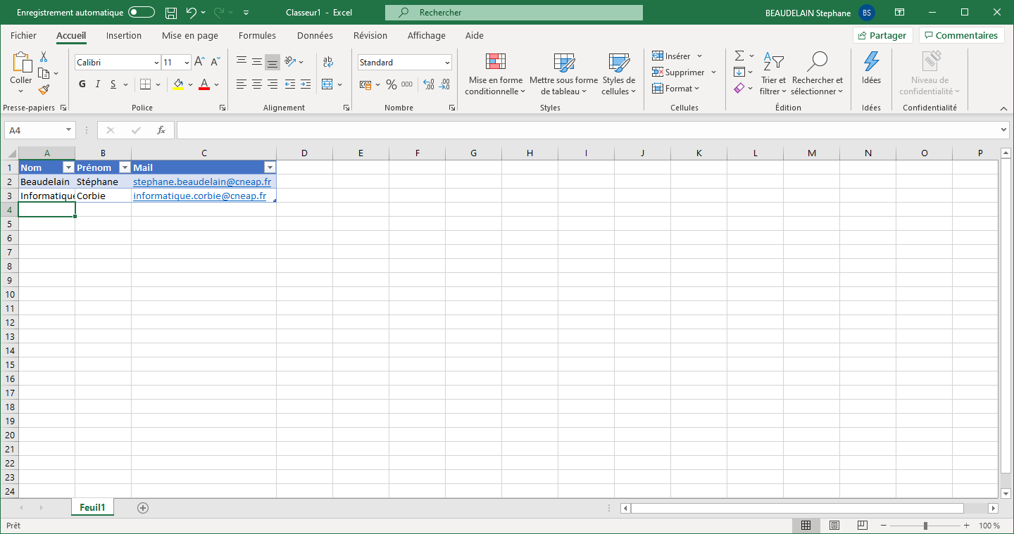 Dans notre exemple, nous allons créer une source de données avec Microsoft Excel et l'enregistrer sur le Bureau