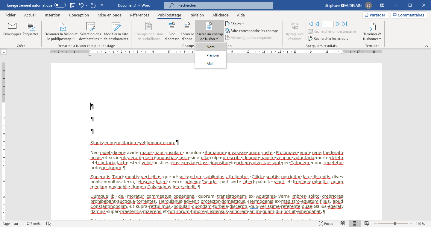 - Cliquer sur "Insérer un champ de fusion" du ruban.