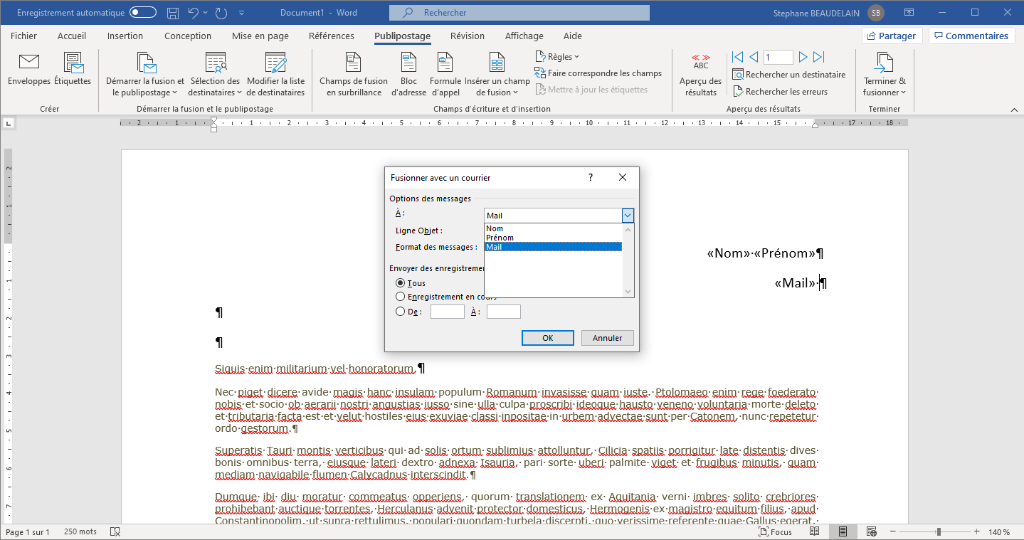 Dans "Options des messages", "À", sélectionner le champ "Mail"